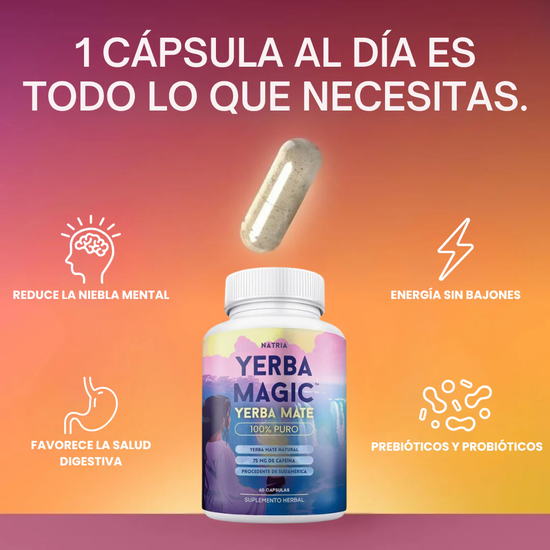 Yerba Magic es un suplemento en cápsulas elaborado con yerba mate 100% pura, diseñado para aportar energía natural, mejorar el enfoque mental y apoyar la salud digestiva.